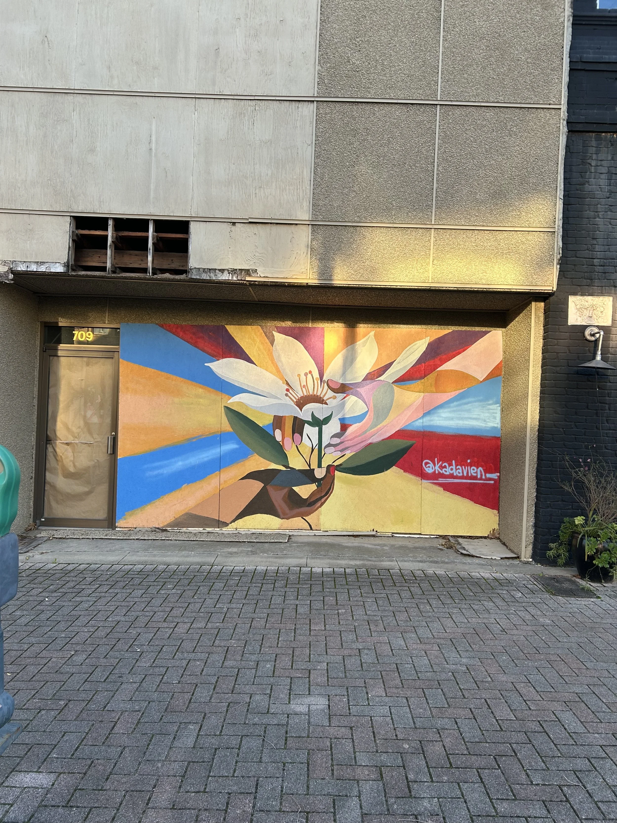 The brown paper cover of the building door certainly detracts from the great window mural.