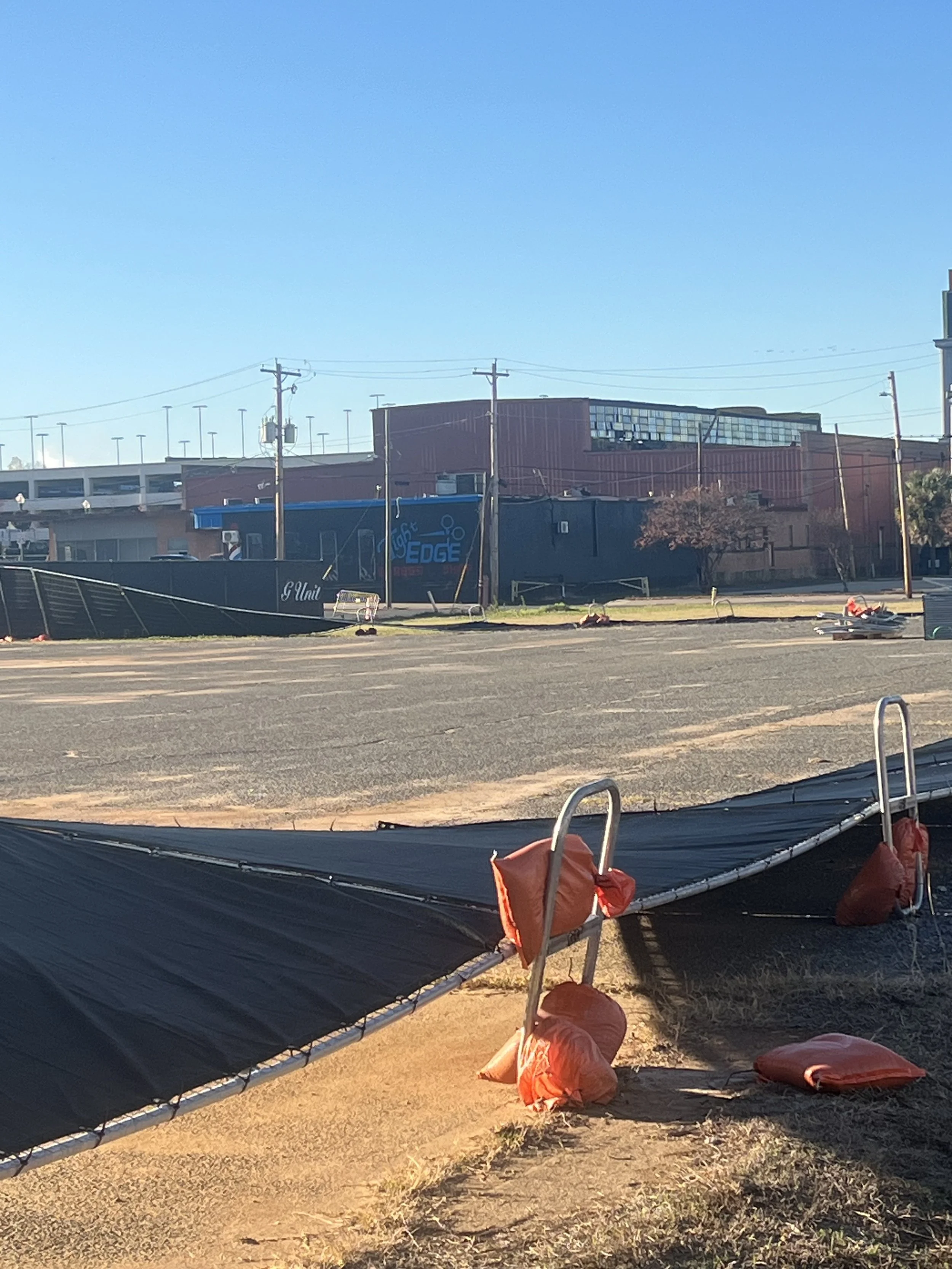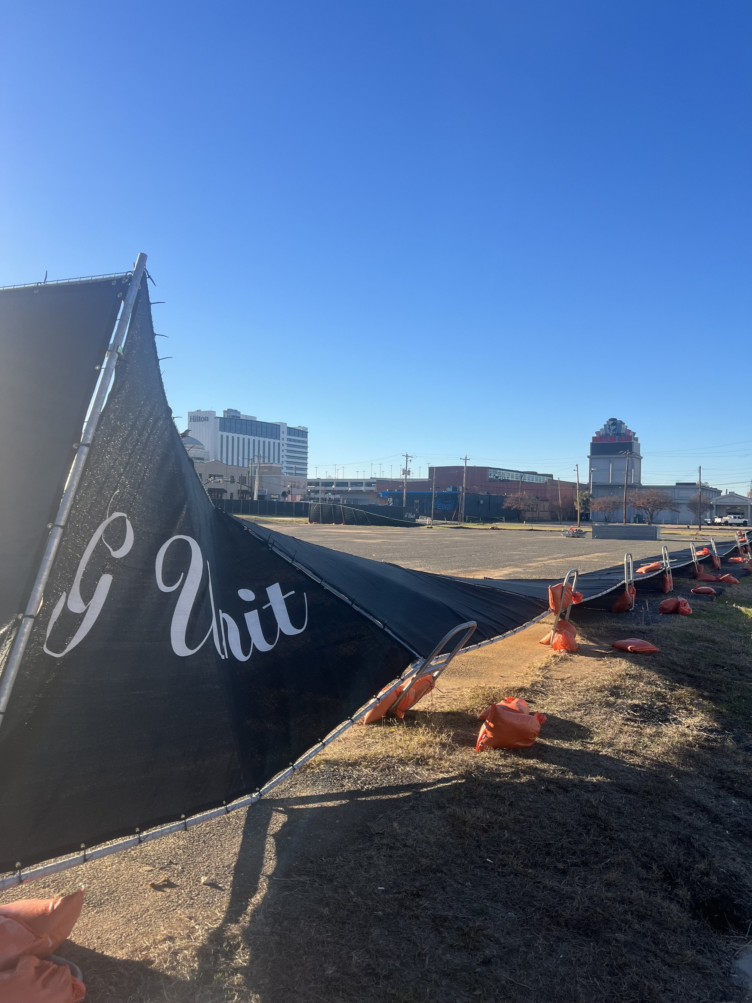 Last month a Marshall Texas company installed a temporary fence around the downtown lot owned by Curtis “50 Cent” Jackson. The fence, or parts of it, have been blown down several times.