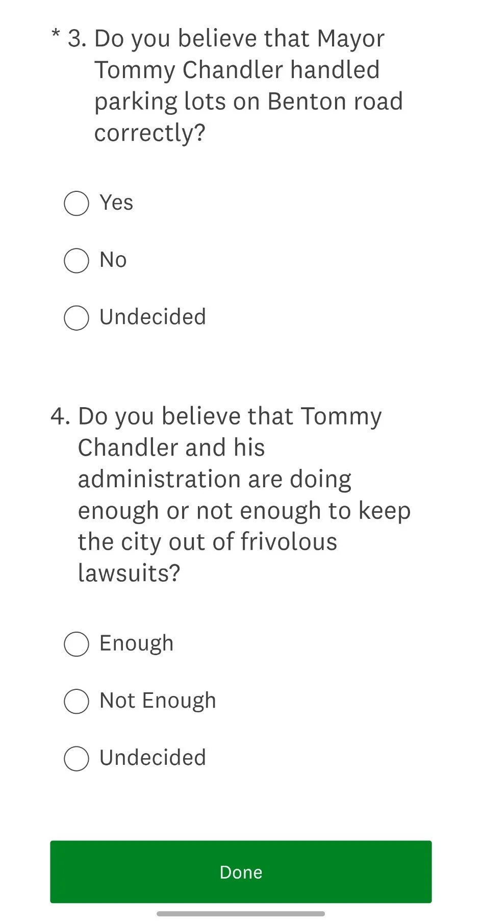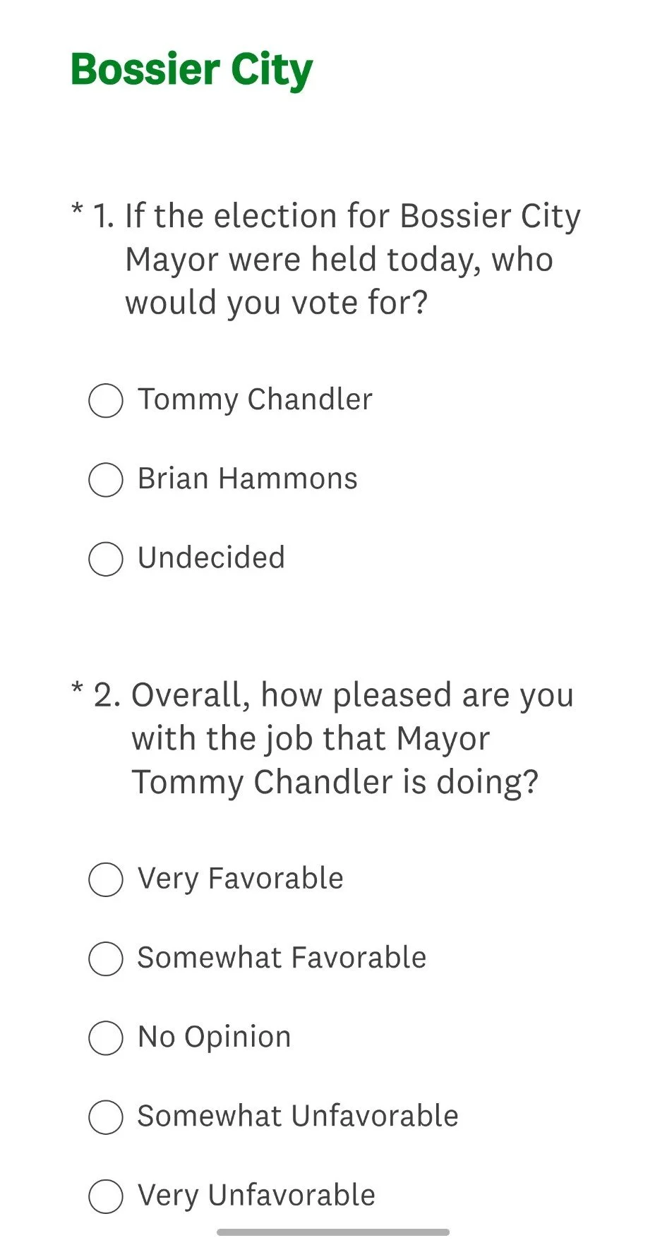 Hammons has NOT publicly announced his future after his current four-year term ends in June 2029. He has confirmed that he did NOT authorize, endorse, or pay for the telephone poll. Bossier city public information officer Louis Johnson has advised that Chandler did NOT authorize, endorse, or pay for the poll.