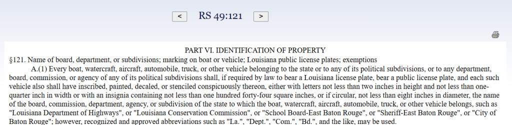 Under Louisiana Revised Statute 49:121, every vehicle owned by the state or any political subdivision, including cities, is required to display the name of the public body to which it belongs. This must be done through decals, stenciling, or painting on the vehicle’s front doors. The law exists to ensure transparency, prevent misuse of government resources, and make it clear to the public when a vehicle is being operated on their dime.