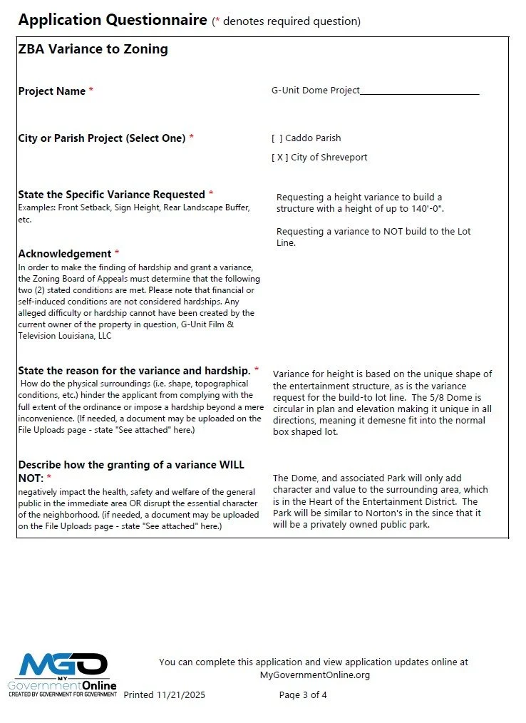 Next Wednesday, Jan. 21, the Shreveport Zoning Board of Appeals will determine a request for a variance for the construction of the proposed G-Dome. The meeting is at the Government Plaza chambers, and it starts at 3 p.m.