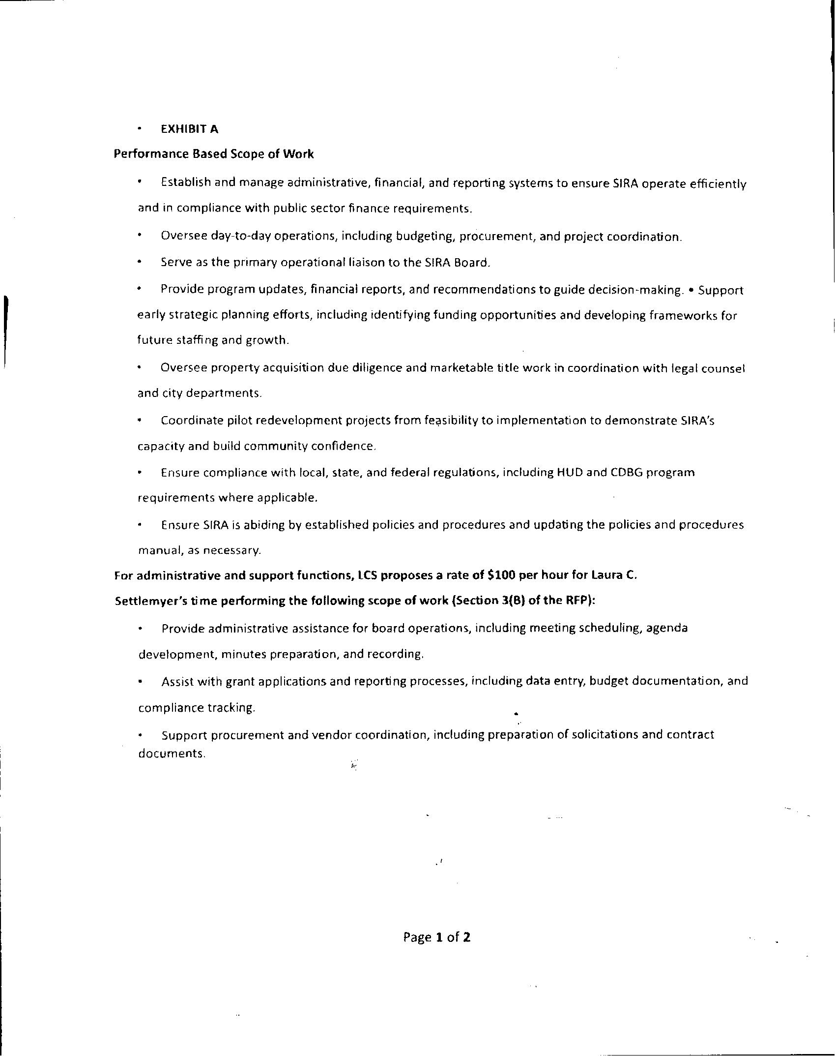 Levee will bill SIRA monthly for operations manager services at $250 per hour and administrative support services at $100 per hour with a total contract price not to exceed $85,000 which includes monthly travel to Shreveport.