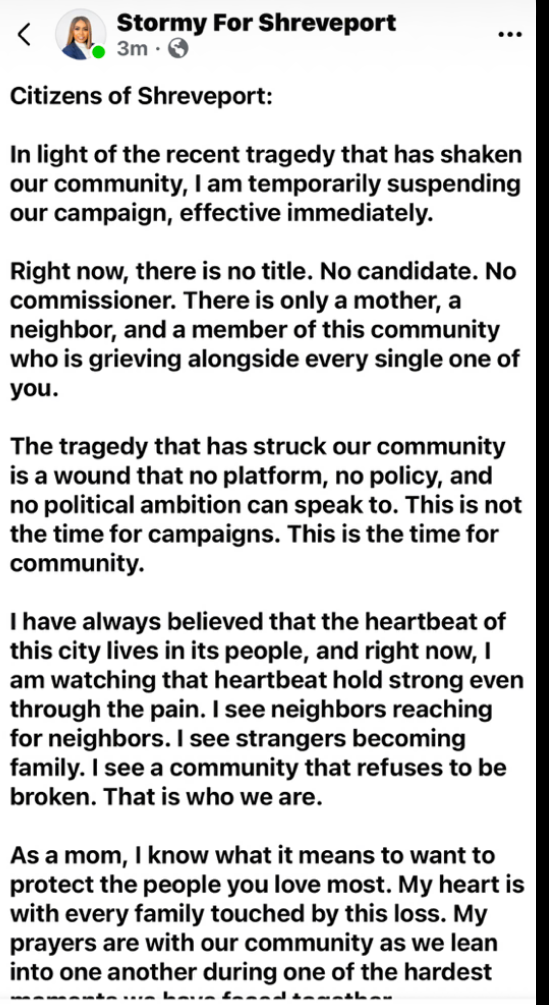 In a Face Book post Caddo Commissioner and mayoral candidate Stormy Gage-Watts announced that she is suspending her campaign immediately.